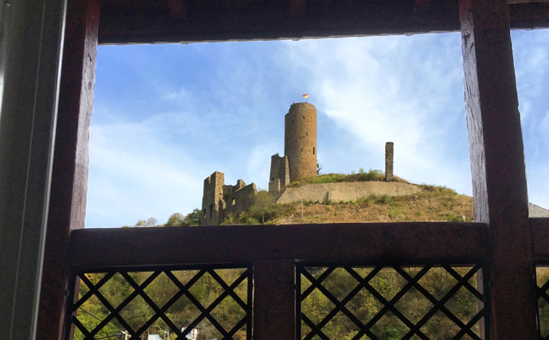Balkon mit Blick auf die Löwenburg Ruine,